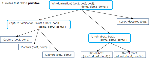 Capture Domination Points task는 세 개의 primitive task로 나뉘어지며, Patrol task는 두 개의 primitive task로 나뉘어진다.