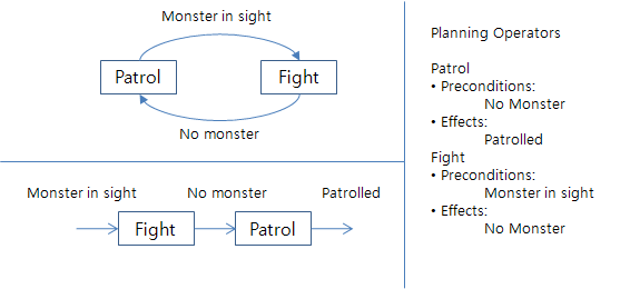 일반적으로 FSM에서의 상태는 GOAP에서 operator로 구현될 수 있다.